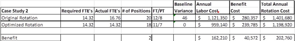 - The Optimizer Module was then utilized and it was determined that only 14.32 FTE’s were required versus the 16.76. Fte’s were reduced to 14.32 and the number of positions decreased from 20 to 18.